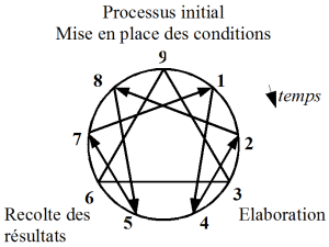 En plaçant deux étapes clefs sur chacune des trois phases ainsi posées, on définit un processus en six étapes qui se succèdent chronologiquement. Dans la figure de l’ennéagramme, des flèches qui posent une relation particulière entre ses points, relient les différentes étapes du schéma selon une dynamique d’interaction qui ne correspond pas au cycle chronologique mais à un circuit de communication. Une étape, pour bien se dérouler, à besoin d’avoir connaissance d’un information qui lui est fournie par l’interaction avec une autre étape, située à l’autre bout d’une flèche dont elle est extrémité de fin.